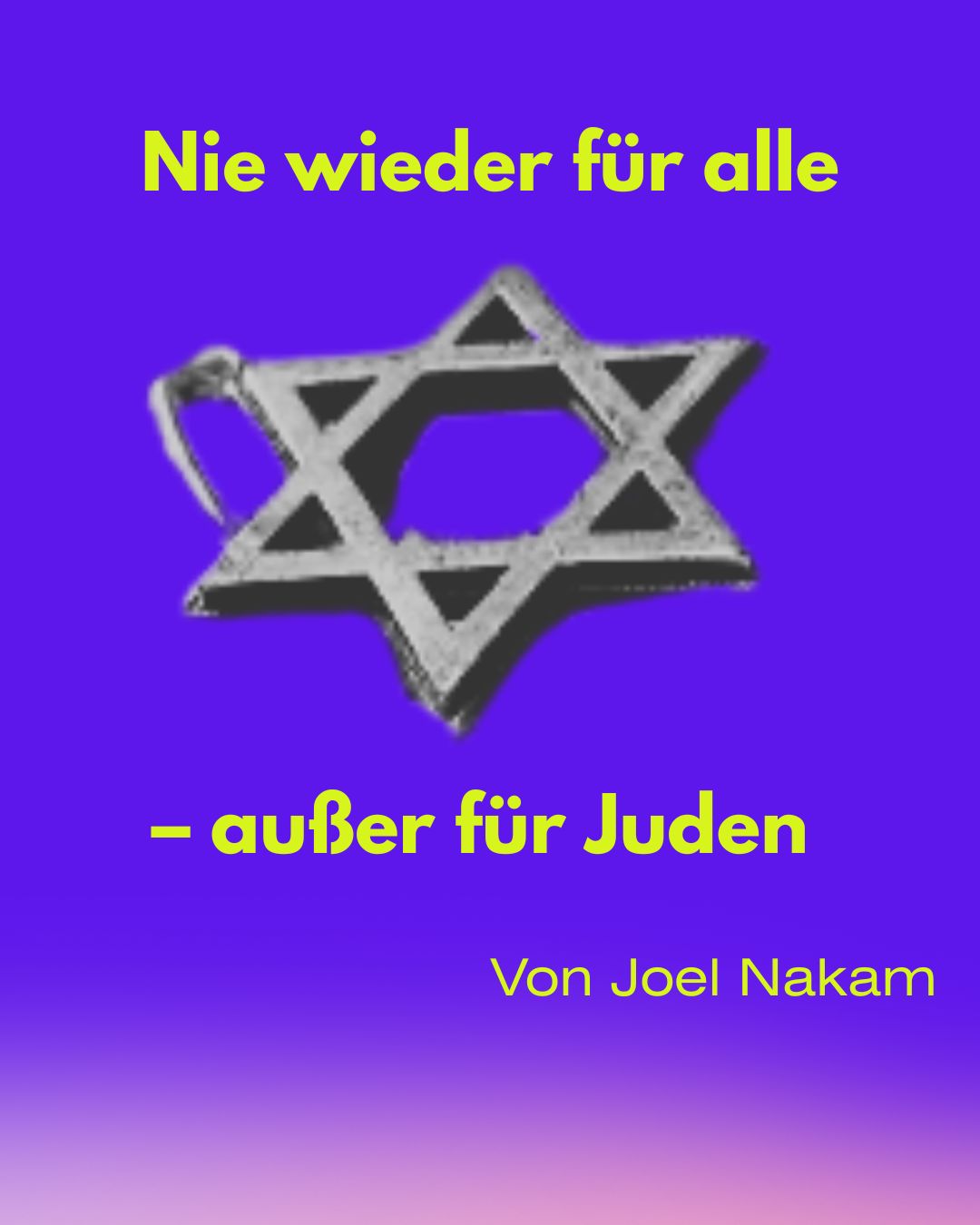 Die Umdeutung „Nie Wieder für Alle“ setzt so dem ganzen noch die Krone auf. Auf den ersten Blick wirkt auch diese Forderung universalistisch, hat es doch kein Volk der Welt verdient, das durchmachen zu müssen, was Juden und JüdInnen im Nationalsozialismus erleiden mussten. Eine Feststellung die jeder, bis auf offene Neo-Nazis und Antisemiten, auch so unterschreiben würden. Also, wo ist jetzt das Problem mit diesem Spruch? „Nie Wieder für Alle“ ist das „All Lives Matter“ der antizionistischen Bewegung. Unter Berufung auf einen Pseudouniversalismus soll die partikulare Leidenserfahrung unsichtbar gemacht ,wenn nicht gar ausgelöscht werden. Inflationäre Vergleiche mit dem Nationalsozialismus sind nun leider keine Neuigkeit. Egal ob Querdenker mit Ungeimpft-Stern, „gecancelte“ Bands wie Frei.Wild, radikale Veganer oder postkoloniale Theoretiker. Die Verbrechen der Nationalsozialisten sind zum Goldstandard der Messung jeder gefühlten oder echten Ungerechtigkeit geworden. So als ob die Deutungshoheit über den Holocaust für jeden frei zur Verfügung stehe. Das ist wenig verwunderlich, wenn man bedenkt, wie viele Menschen Juden und JüdInnen unterstellen, wir würden Profit aus unserem Leid durch die Schoa schlagen. Da ist es kein weiter Sprung dazu, dass diese Leute auch ein Stück von diesem Kuchen abhaben wollen. Aber in diesem Fall ist es leider natürlich nicht nur das. „Nie wieder für Alle“ wird vor allem von Menschen beschworen, die in Israel die neuen Nazis und in den Palästinensern die neuen Juden sehen. Eine Täter-Opfer Umkehr, die sich perfekt für Schuldabwehr eignet und Israel dämonisiert. An dieser Phrase können wir beobachten, wie dieser Pseudouniversalismus gegen die unterstellte partikulare Position der Juden und JüdInnen gerichtet wird. Es ist also auch ein Angriff auf die Singularität der Schoa wie wir sie auch im Zuge des Historikerstreits 2.0 beobachten können. Diese ständige Gleichsetzung mit unserem tiefsitzenden intergenerationalen Trauma dient hierbei als Waffe gegen Juden und JüdInnen. Ein paar Beispiele für dieses Phänomen lässt sich in der Instrumentalisierung und Verdrehung jüdischer Widerstandsgeschichte sehen, die dazu dient, den heutigen Antisemitischen Terror zu legitimieren. So haben es sich zig pro-palästinische AktivistInnen nicht nehmen lassen, immer wieder den 7. Oktober mit dem Aufstand im Warschauer Ghetto zu vergleichen oder Gaza gar als Konzentrationslager zu bezeichnen. Auch der furchtbare Mordanschlag auf Sarah Milgrim und Yaron Lischinsky in Washington DC wurde von der Gruppe „Handala Leipzig“ mit der Tat von Herschel Grynszpan verglichen. Dieser hatte am 7 November 1938 aus Verzweiflung über die Lage seiner Familie in NS-Deutschland den NS-Diplomaten Ernst von Rath erschossen. Diese Attacke wurde als Vorwand genommen, um die darauffolgenden November Pogrome zu rechtfertigen. Dass die Gleichsetzungen Israels mit dem NS Regime, trotz rechter Fehlleitungen in der Israelischen Regierung, absurd ist, sollte ich hier nicht erklären müssen. Sie entbehren jeglicher Grundlage, sind aber nicht nur Diffamierungen, sondern zielen auch auf das jüdische Trauma ab, um emotionales Leid zu verursachen, unsere Wahrnehmung zu untergraben und so wie jede Form der Holocaust Relativierung die Geschichte für sich und gegen uns zu vereinnahmen. Damit diese Dreistigkeit nicht zu schnell auffliegt, braucht es einen performativen Mantel des Humanismus.